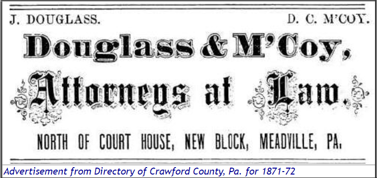 attorney and counselor at law, Meadville, was born in Rochester, N. Y. , August 1, 1826. His parents came to Meadville in 1832 and settled on a farm in Mead Township. Our subject acquired his education mostly at the academy in Meadville, and studied law with Hon. A. B. Richmond. He was married in 1848 to Calsina L. Finch, who died in 1849. He was again married in 1853 to Lavantia, daughter of Joel and Sophia Densmore, of Erie City. Their silver wedding was celebrated October 4, 1878. Their children are Marion, born February 7, 1855, married December 22, 1875, to Charles W. Lane, of Meadville (have two children: Ralph, born May 9, 1877, and Elsie, born December 14, 1878); Ellen, born July 19, 1858, married June 23, 1880, to Cornelius Van Home, attorney, of Meadville, Penn. (had one child, Robert, born March 23, 1884); Robert, born November 17, 1861, died in 1862; Mabel, born February 22, 1864, married in July, 1882, to Harry C. Flood, of Meadville, Penn., and Gertrude, born November 8, 1866. Mr. and Mrs. Douglass are members of the Unitarian Congregation of Meadville. In 1850 Mr. Douglass went to California; returned in 1852 and commenced to read law, in which he has been