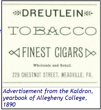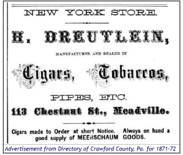 Dreutein, Henry, cigar manufacturer, Meadville, was born in Germany, November 8, 1848, and is a son of Christopher Dreutlein, by occupation a miller, but who followed cigar making after he came to America in 1860. Henry, who is the eldest of a family of five children, received his education in his native land, and naturally learned from his father the art of manufacturing cigars. He came to Meadville in 1866, established his business here and has met with more than average success, all his brands of cigars being well and favorably known. He was married in 1872 to